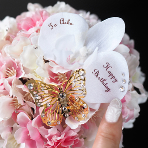 胡蝶蘭の花を添えれば、花びらにメッセージのプリントが可能です。