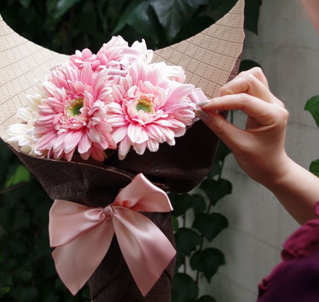 ガーベラのお花は、淡いピンクとクリーム色をミックスした優しい色合いとなっております。また、ガーベラの間には蝶々のように、リボンが施されています。まさに女心をつかむ可愛いこだわりに彼女も大満足するでしょう。
